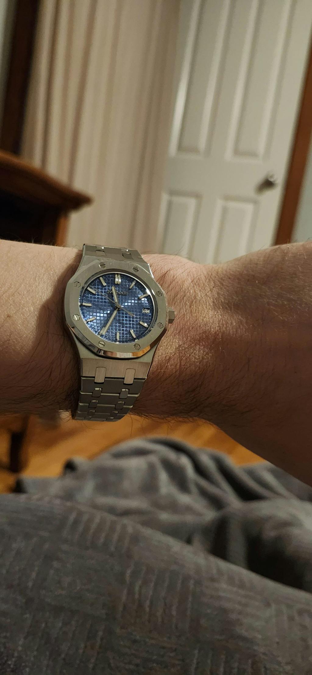 First of all, the watch looks amazing, I opted for the 37mm silver Royal Oak case, nh72 with v2 rose gold hands… Worked out great!