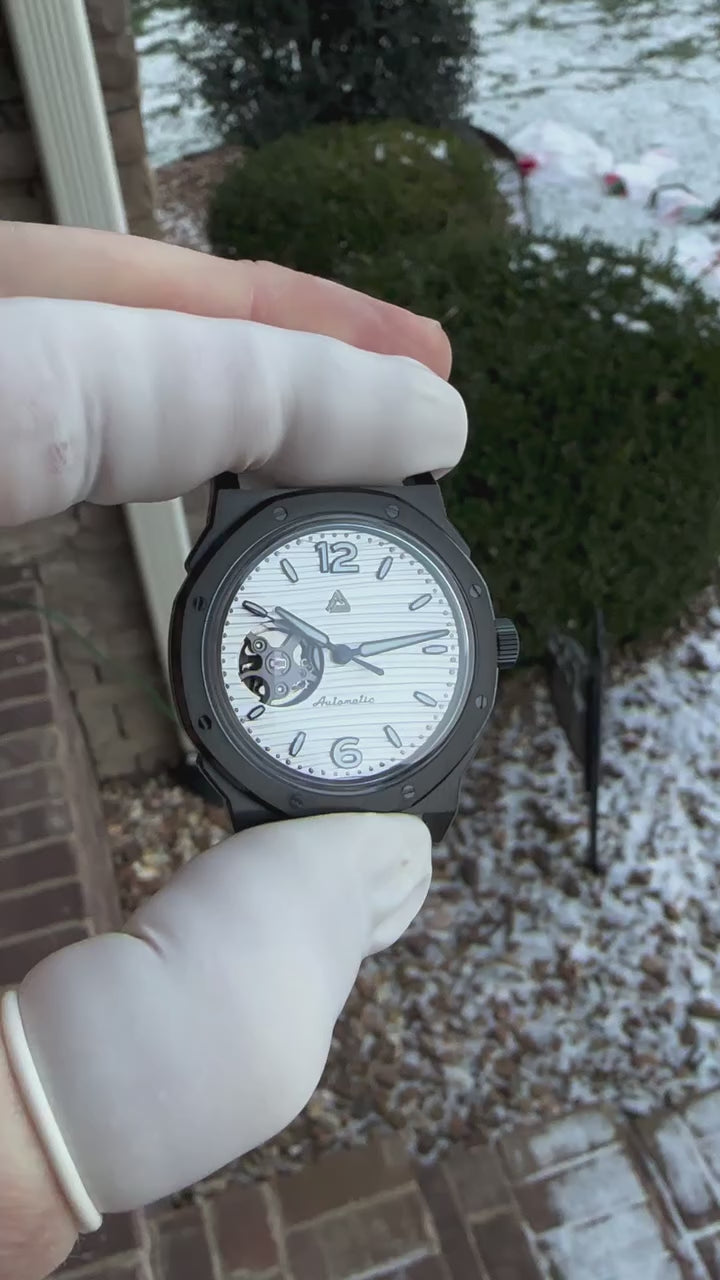 Le Petrichor Black PVD montre à quel point une finition peut changer radicalement un design. Les mêmes courbes qui évoquent chaleur et vintage en argenté ou doré deviennent furtivité et modernité en noir. Le revêtement PVD est appliqué par dépôt physique en phase vapeur pour une durabilité à long terme – ce n'est pas de la peinture ou de l'anodisation, mais un traitement de surface au niveau moléculaire qui se lie à l'acier. Sur les contours arrondis du Petrichor, la finition noire mate crée des dégradés subtils de lumière sur la surface du boîtier plutôt que le noir plat et sans vie que l'on obtient sur les boîtiers angulaires. Le verre saphir bombé s'insère parfaitement dans le profil du boîtier, maintenant la silhouette fluide qui définit le Petrichor. Chaque boîtier est contrôlé pour l'uniformité du revêtement et la qualité de finition avant expédition.
